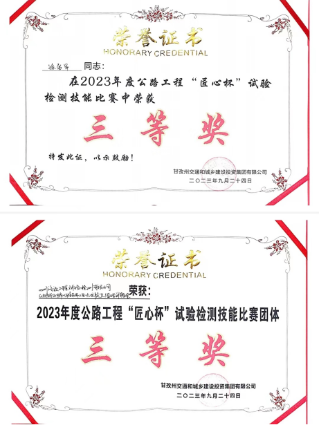 公司徐勇軍和高峰在2023年度公路工程“匠心杯”試驗檢測技能比賽中榮獲團體賽第三名,并且徐勇軍個人榮獲第三名獎項